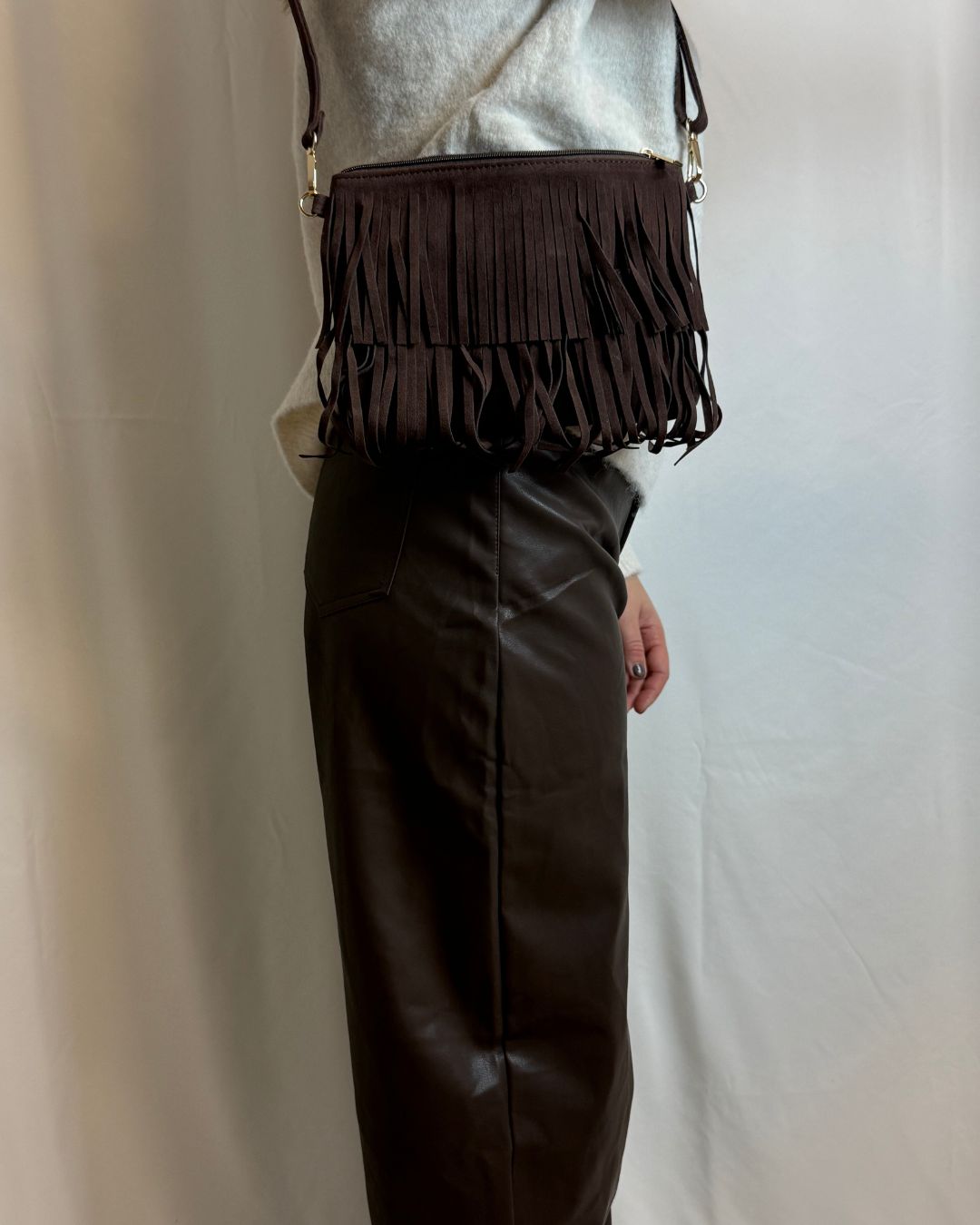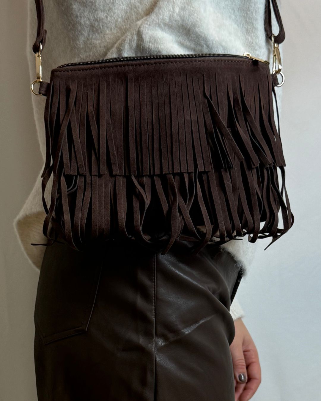 Deze bruine franje tas is een stijlvolle en speelse toevoeging aan je outfit. De franjes geven de tas een leuke beweging en maken hem perfect voor zowel casual als feestelijke looks. Shop deze tas ook in het taupe